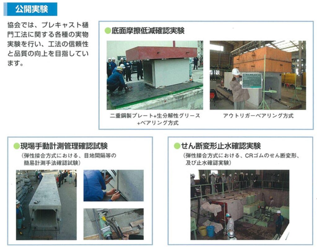 プレキャスト樋門工法に関する各種実物実験を行い、工法の信頼性と品質の向上に努めています。